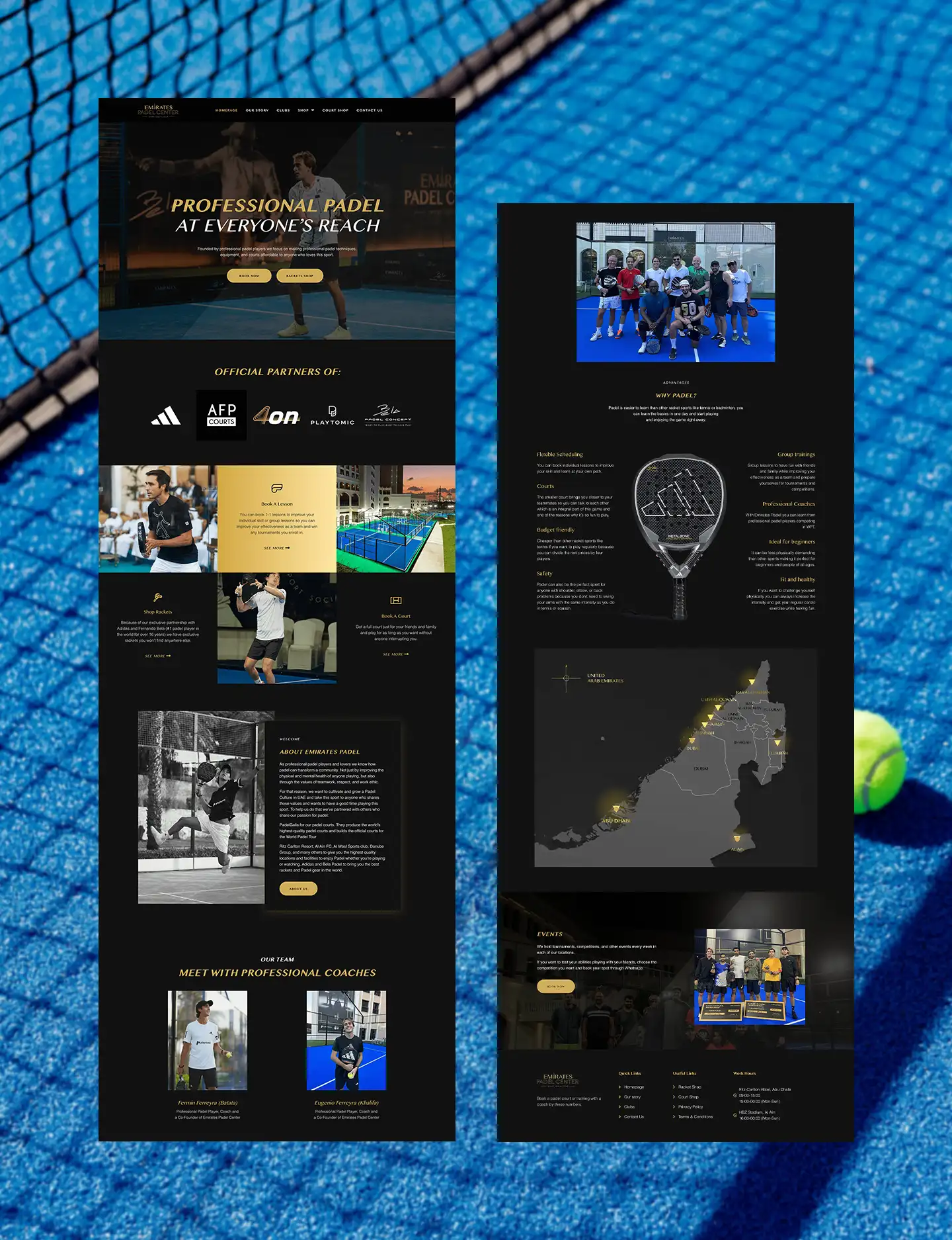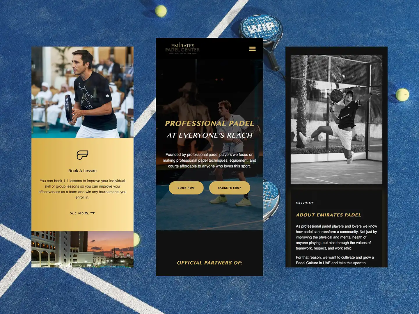 The Emirates Padel website was developed with a mobile-first, fully responsive layout that features court booking functionality, detailed team information, and an integrated e-commerce store for padel equipment.